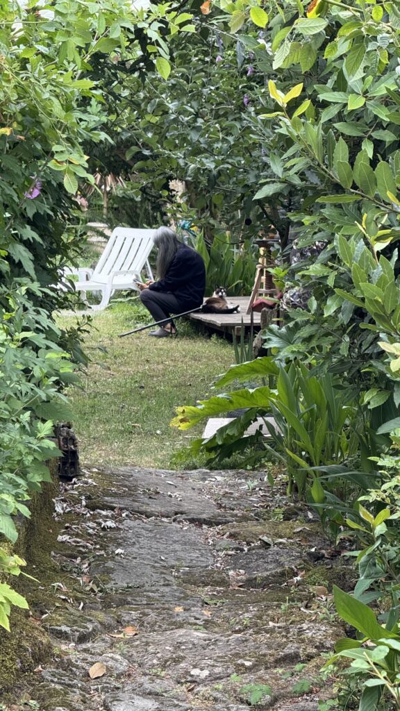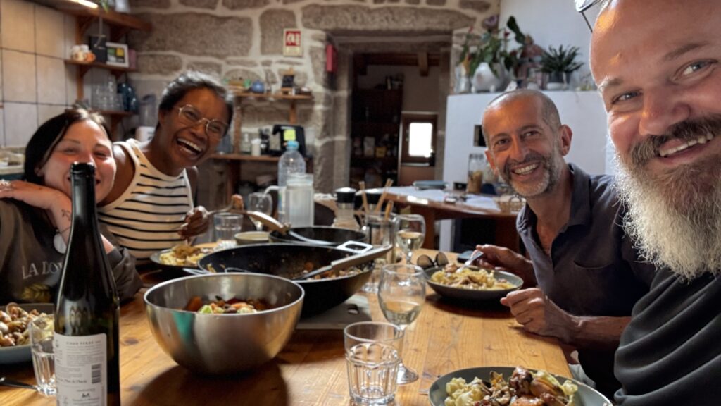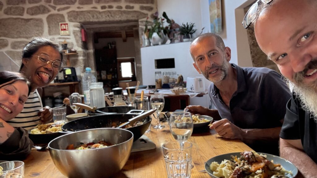 Wir essen mit einem französischen Nachbarn „Eric“, der während einer Pilgerreise einst eine Ruine fand, sie kaufte, sanierte – und heute in einer alten Mühle lebt. Traumhaus. Mit wenigen Touristen verdient er genug zum Leben, mehr braucht er nicht. Warum wird klar, sobald man die ganze Schönheit auf Booking.com betrachtet. Ich mag solche Geschichten – vom Loslassen, Finden und Bleiben.