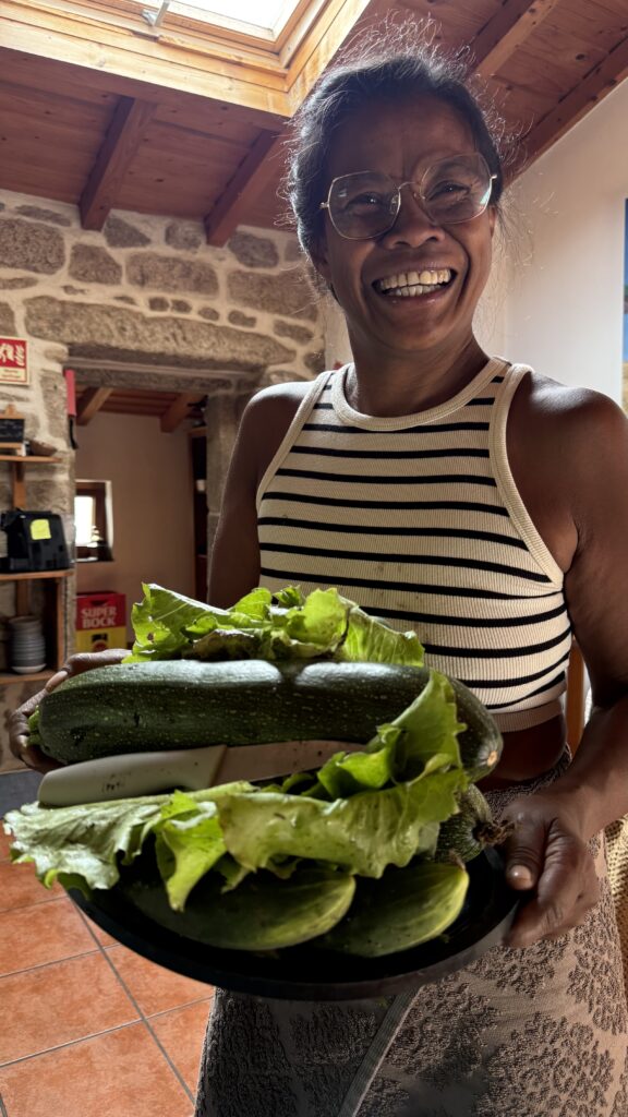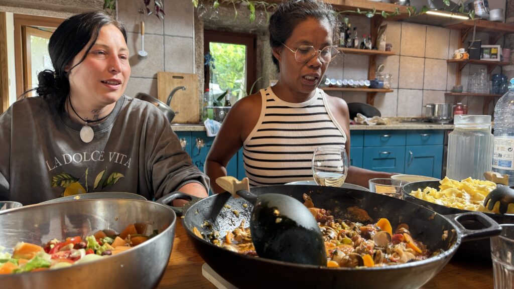 Das Essen schmeckt, als hätte es ein Sternemenü ins Hier und Jetzt verschlagen. Alles kommt aus dem Garten, sonnenverwöhnt, frisch und ehrlich. Und während wir da sitzen, lachen, trinken und Geschichten teilen, spüre ich: Genau deshalb ist dieser Ort heute mein Zuhause. Zumindest für diesen Moment.