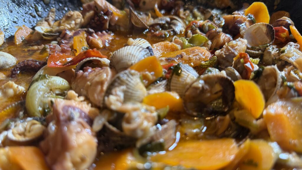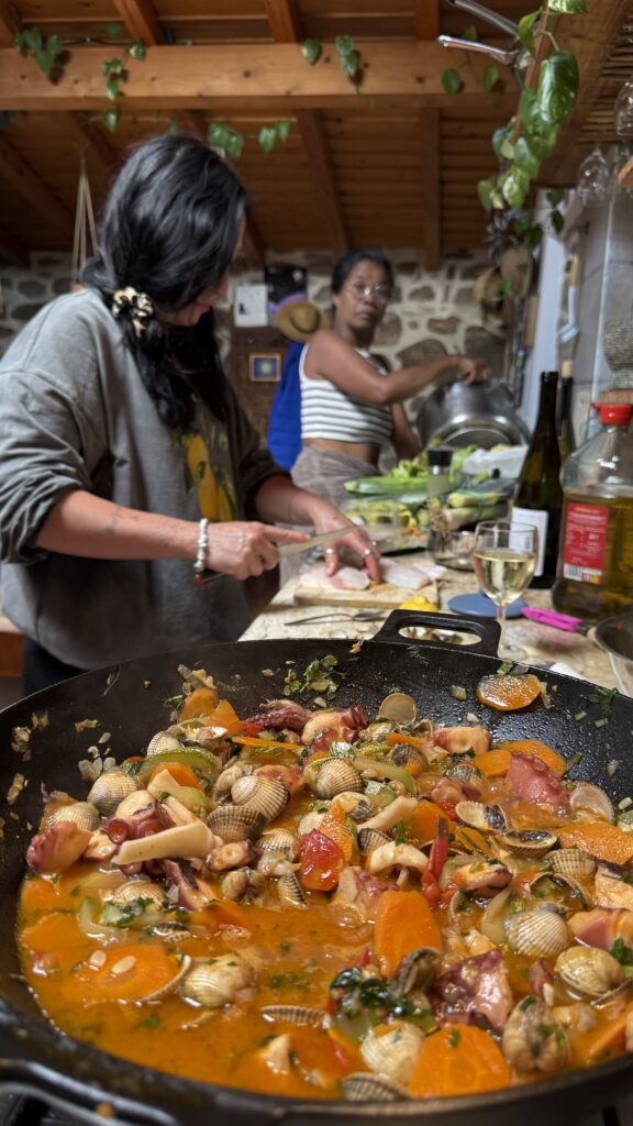 Der Abend lässt die Made vergessen: Laura, Haingo (Volontärin aus Madagaskar) und ich zaubern zusammen. Also gut, ich schnipple, der Rest zaubert. Es gibt Pulpo, Muscheln, Dorade, Zucchini, Karotten – alles mit bestem Olivenöl und Knoblauch verfeinert. Die Nudeln garen nebenbei, und als Salatschleuder dient ein rotierendes Schultergelenk im Handtuch-Modus. MacGyver wäre stolz.