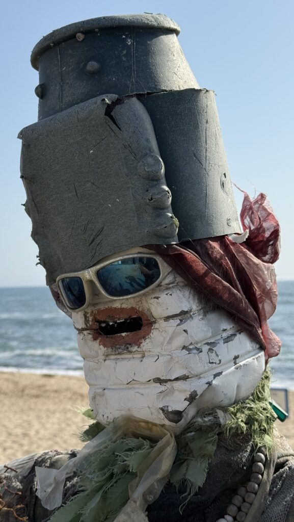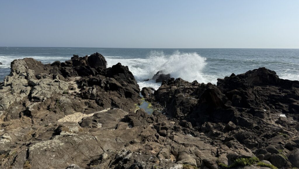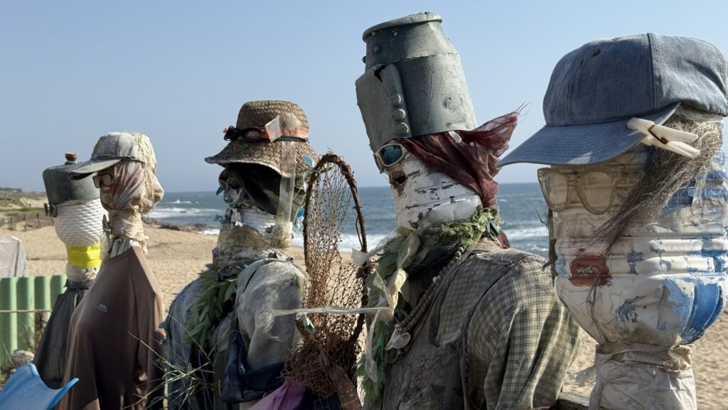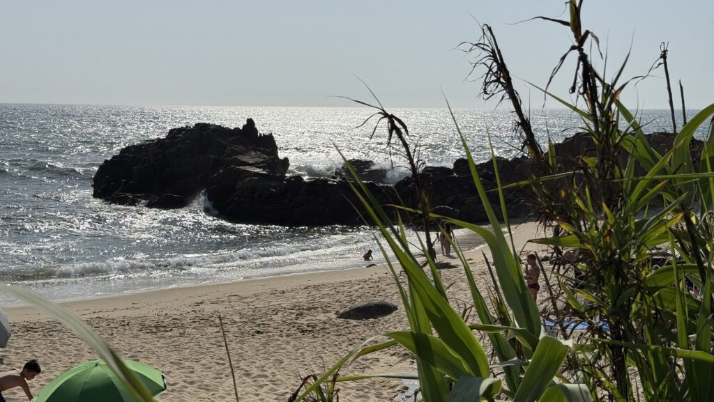 Asphalt, Pflastersteine, mehr Asphalt. Die ersten 8,5 Kilometer waren eine Ode an alles, was hart, heiß und fußunfreundlich ist. Erst am Strand kam die Erlösung – Holzplanken, Atlantikwind, endlich ein bisschen Natur unter den Sohlen. Ich setzte mich in den Schatten, atmete durch, aß einen Salatteller und ließ meine Füße an der frischen Luft baumeln – denn ich weiß inzwischen: Lüften ist Pflicht. Wer lüftet, läuft länger. Dachte ich.