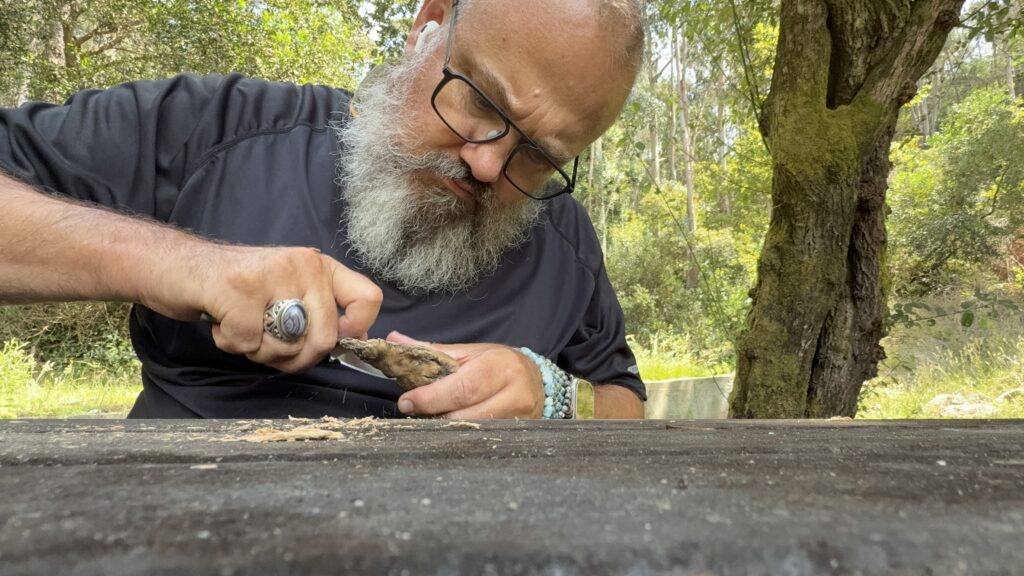 Mittags dann Pause. Die Füße rebellieren, also streike ich auf einer Bank im Schatten eines Baumes. Ich mache ein Nickerchen – himmlisch. Danach bearbeite ich ein Stück Holz, das ich für meine Kinder gesammelt habe. Ich entferne alles Unnötige, glätte die Oberfläche. Fast wie eine kleine Meditation.