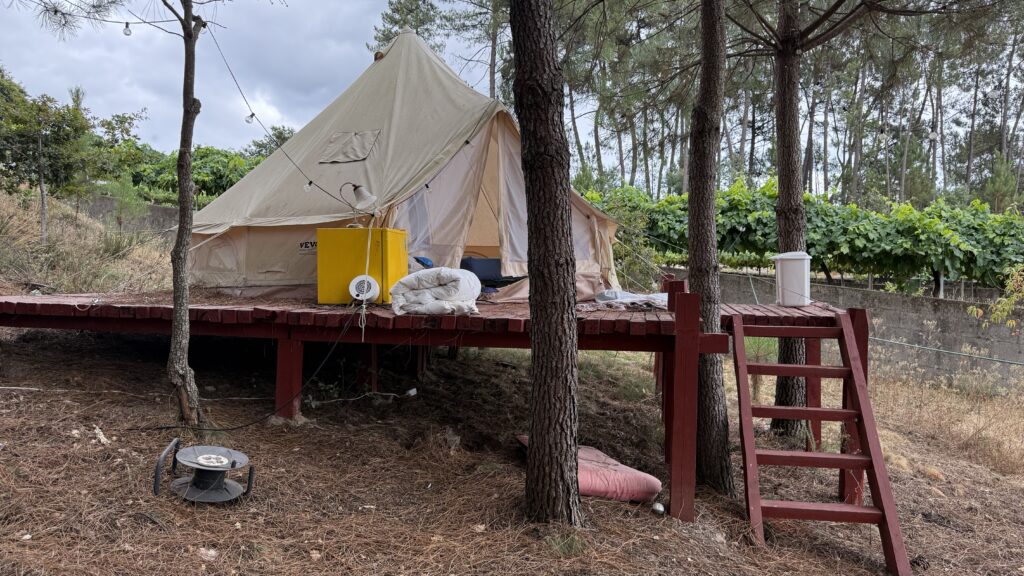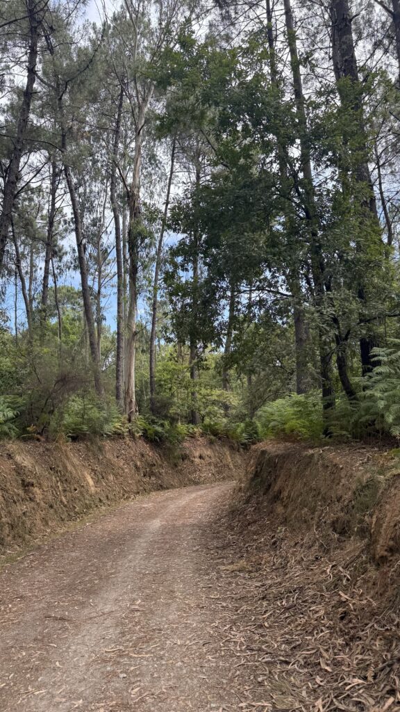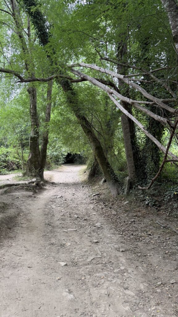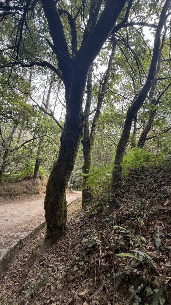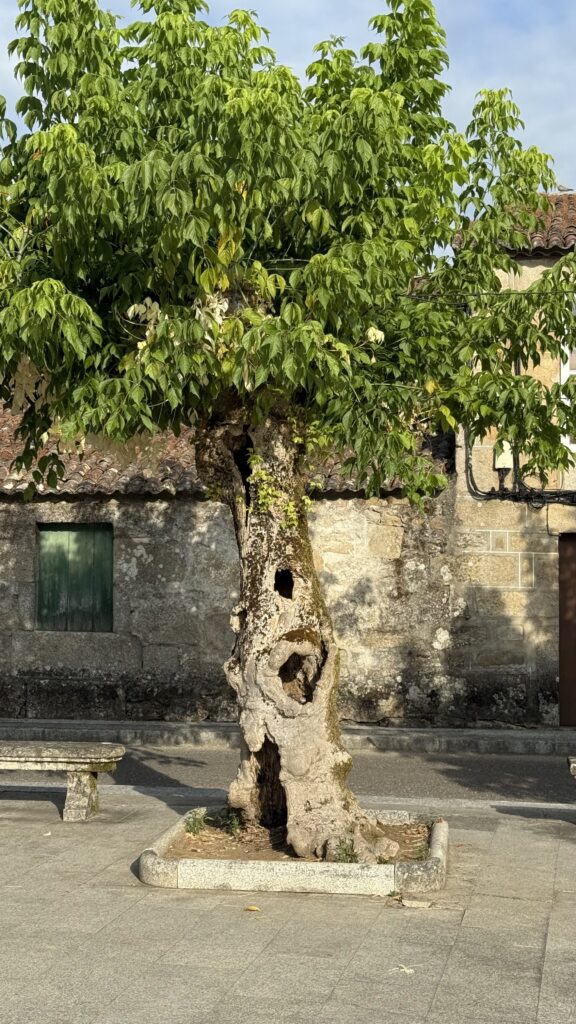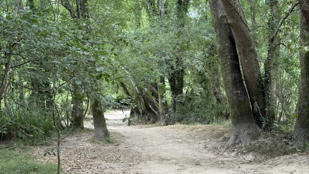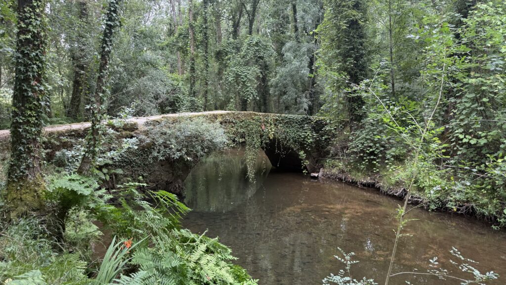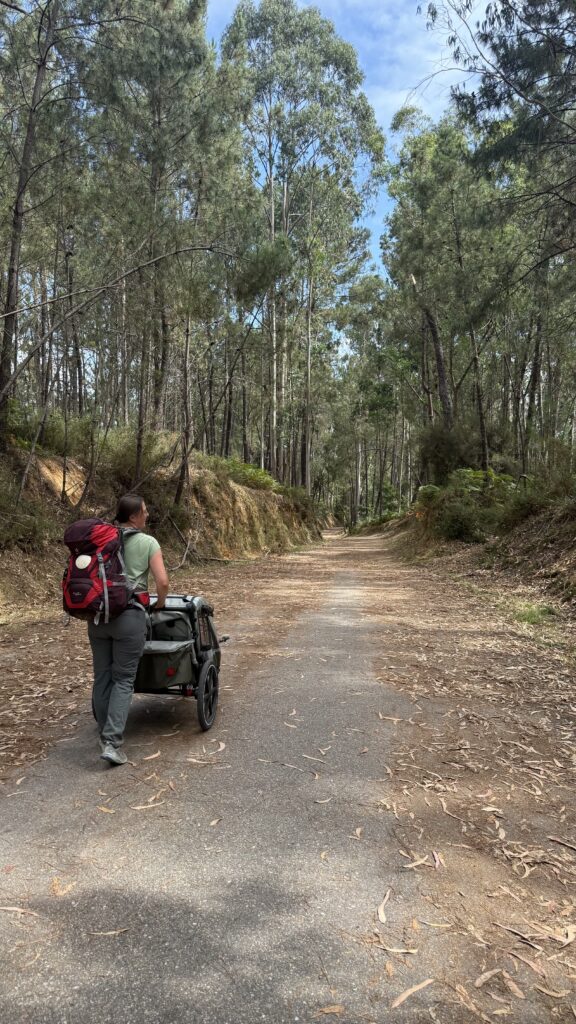 Ich laufe früh los – eigentlich zu früh. Aber die Massen von Valença haben noch nicht aufgeschlossen, also nutze ich die Ruhe und lasse mich treiben. Die Landschaft ist grün, friedlich, der Weg schlängelt sich sanft durch kleine Wälder und Felder. Und dann – wie aus dem Nichts – treffe ich Tina wieder. Die Mutter aus Thüringen, unterwegs mit ihrem kleinen Richard im Kinderwagen. Wir laufen ein Stück gemeinsam, unterhalten uns über Gott und die Welt, das Leben, den Weg. Ich bewundere sie aufrichtig – was sie da leistet, ist kein Spaziergang. Das ist ein echter Kraftakt. Kinderwagen auf dem Jakobsweg? Da braucht es mehr als nur gute Schuhe.