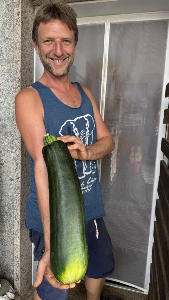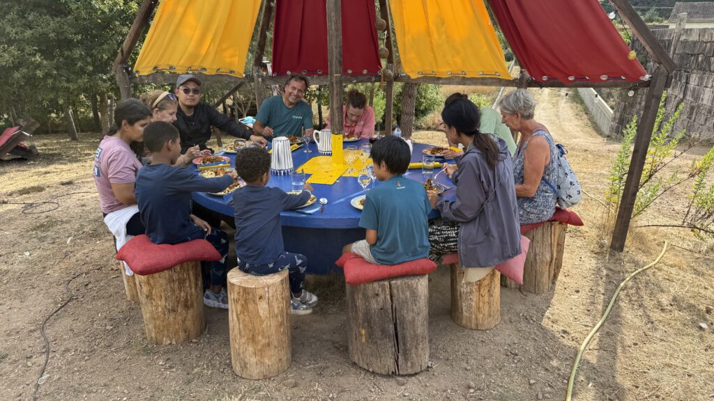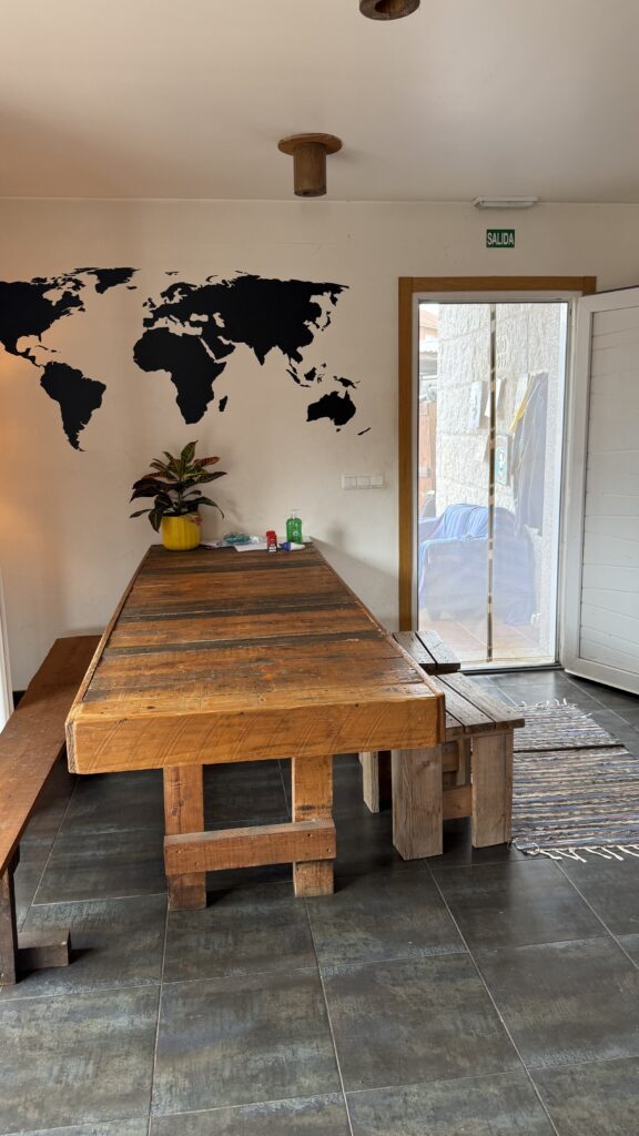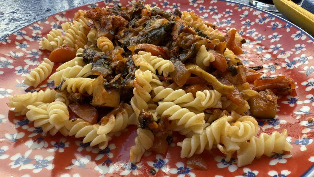 Am Abend sitzen wir alle gemeinsam am großen Tisch der Herberge. Dreizehn Menschen, acht Nationen. Multikulti. Jeder mit seiner Geschichte, seinem Tempo, seinen Wehwehchen. Aber heute teilen wir diesen Moment. Es gibt Wasser. Es gibt Wein. Es gibt Pasta mit Auberginen und allerlei buntem Gemüse. Alternativ im „Casa Alternativo“, klar. Die Küche ist vegan, wie zu erwarten. Niemand vermisst das Fleisch. Im Gegenteil. Es schmeckt einfach unfassbar gut.