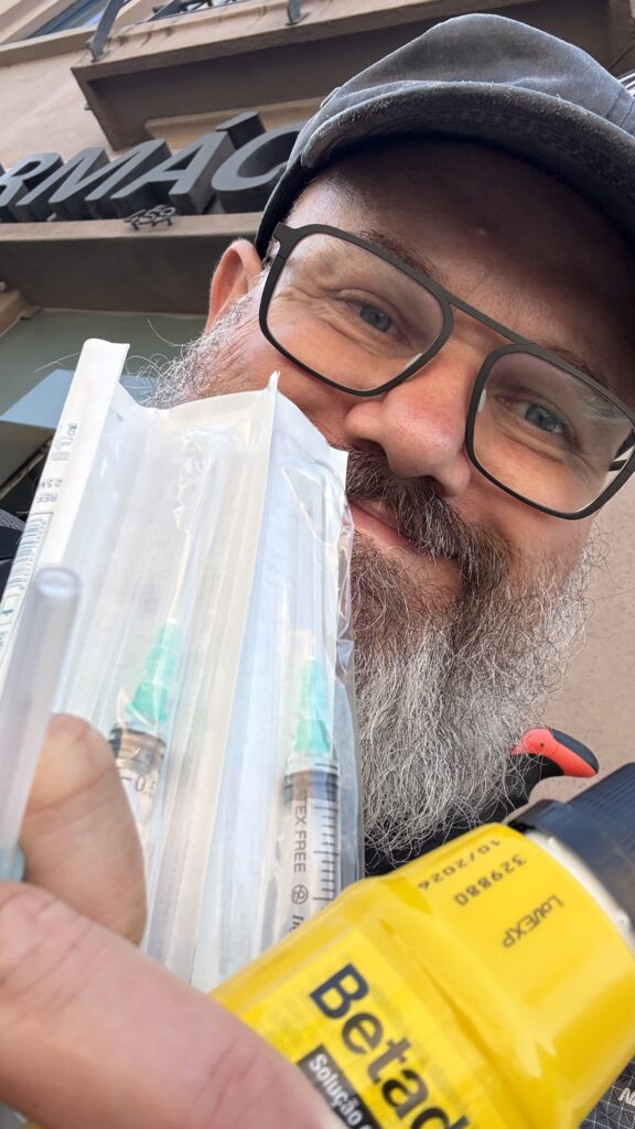 Am Nachmittag geht es weiter in die nächste Stadt „Vila do Conde“ – mein Ziel für heute. Die Füße schmerzen, machen (sehr) langsam und schon bald kommt sie – die Erlösung: eine kleine Apotheke. Zufall? Vielleicht. Der Kracher ist jedoch, dass sie mein Wundermittel gegen Wasserblasen führt: Betadine. Gibt’s bei uns nicht mehr – hier schon. Und in Spanien sowieso. Passend dazu: vier Spritzen (Wasser raus, Betadine rein). Man weiß ja nie.