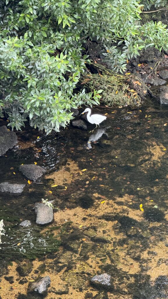 Elegant wie eine Balletttänzerin auf Zehenspitzen, mit knallgelben Füßen, die ein kleiner, weißer Reiher auffällig im Wasser wackeln lässt – als hätte er irgendwo gelesen, dass man Fische durch diskrete Fußmassage zum Beißen animiert. Und tatsächlich: Einer nach dem anderen kommt neugierig angeschwommen und testet die „Reiherpediküre“. Ein letzter Happen – zack – Fisch weg.
