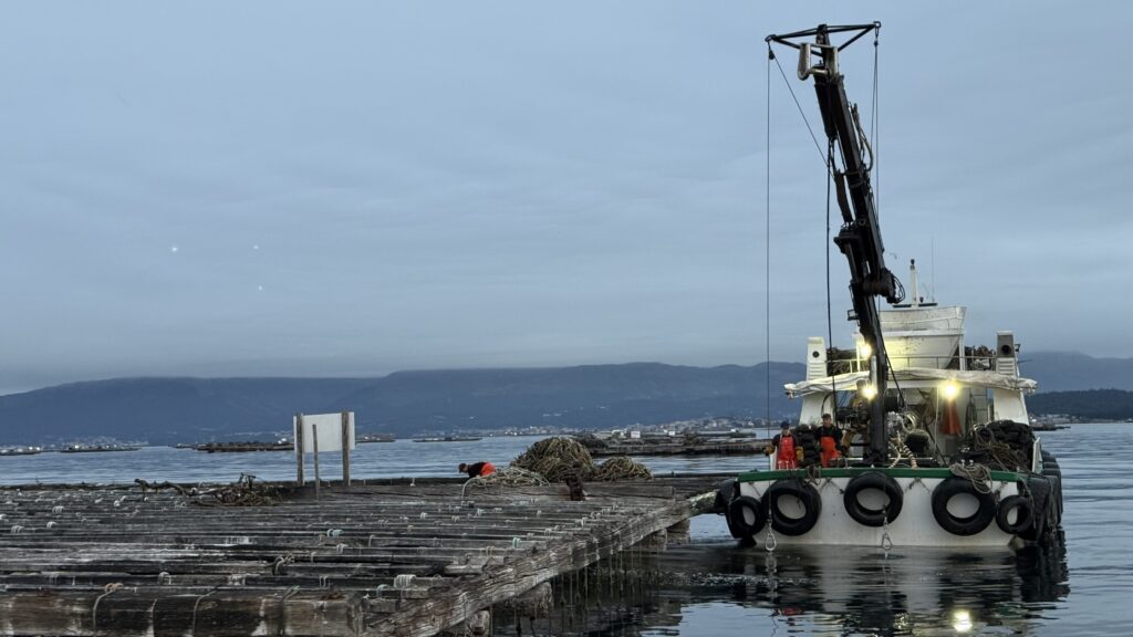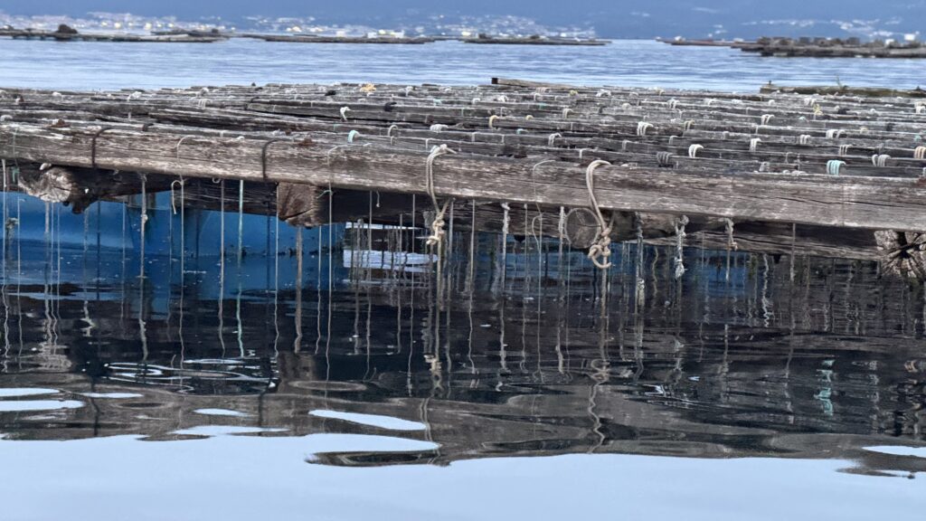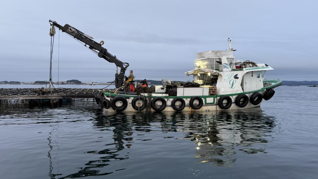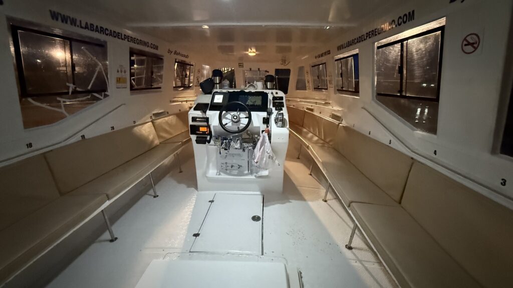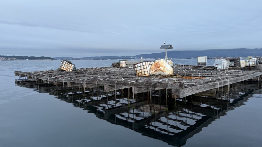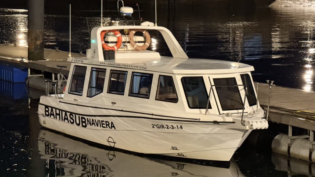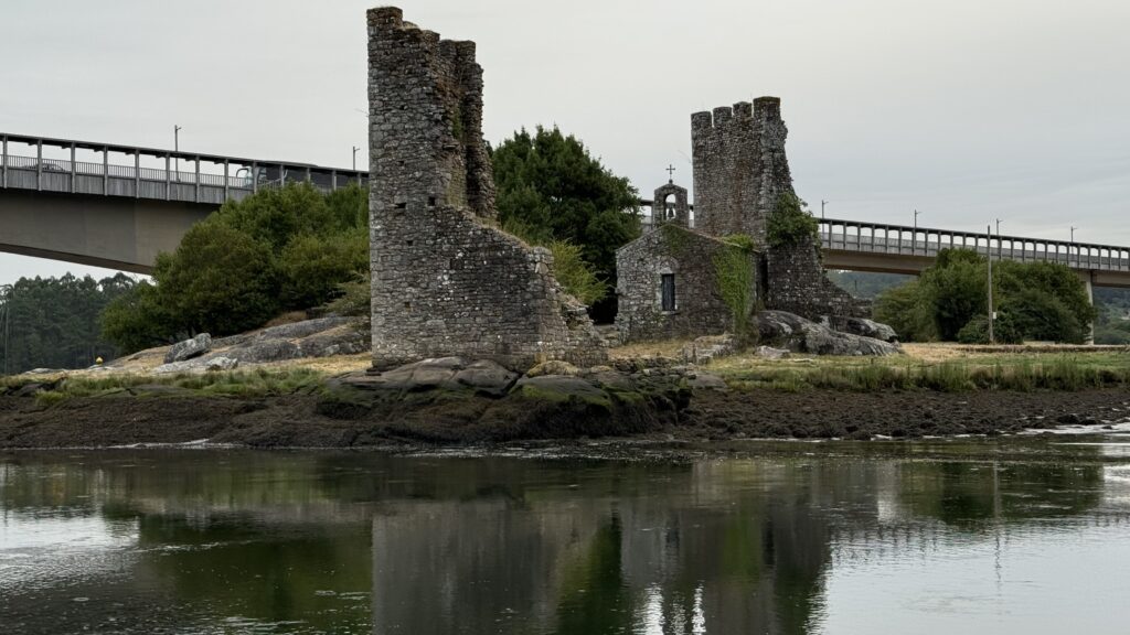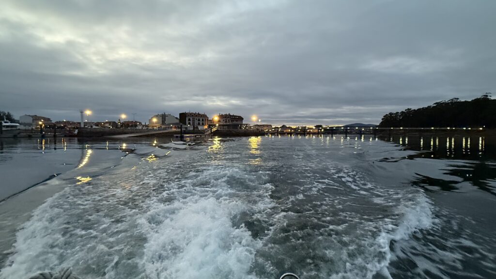 Aber hey, genug davon – der Camino ruft, und ich will heute pünktlich am Boot sein. 6:30 Uhr liege ich am Kai auf der Lauer, 7:05 Uhr starten wir. Die Überfahrt nach Padrón. Ein bisschen mystisch, ein bisschen Touri-Show, ein bisschen Delfin. Ja, wirklich: Delfine! Ich sehe sie – ganz kurz – sie begleiten die Muschelfischer, die gerade ihre Seile durch Maschinen ziehen. Die Muscheln frisch abgestreift, purzeln ins Sieb, die Fische stürzen sich auf die Bruchstücke – und die Delfine holen sich, die Bruchstückjäger. Fressen und gefressen werden. Das große Gleichgewicht. Ich versuche, ein Foto zu machen – keine Chance – unten schmeckt es besser als das viele Öl, dass unser Schiff (leider!) verliert. Aber die Delfin-Szene bleibt. Direkt abgespeichert in meinem Herzen.