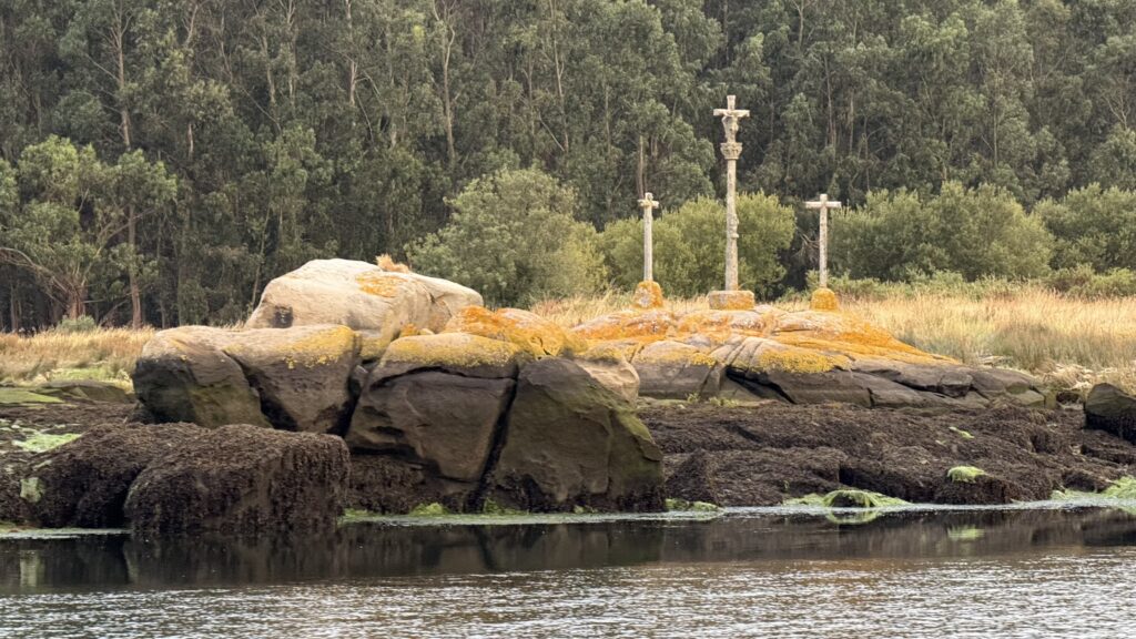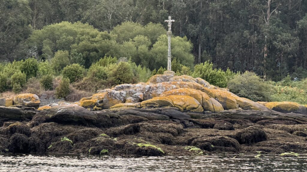 An Bord unterhalte ich mich mit einer Finnin – auch ihr zweiter Camino. Sie ist durch mit dem Thema. Zu viel Kommerz, zu viele hohle Gespräche, zu viel Esoterik-Geklingel ohne Substanz. Und just in dem Moment erfüllt sich die Prophezeiung: Eine andere Dame hält lautstark einen Monolog über den Stein, den sie die ganze Strecke getragen hat, um ihn heute – bei den Kreuzen – dramatisch ins Wasser zu werfen. In Szene gesetzt. Gefilmt. Für Instagram. Fürs innere Gleichgewicht. Für die Likes. Sie selbst erzählt mir – emotional vom Eisberg geküsst: „Wow, war das ein bewegender Moment“. Bewegt hat es, so glaube ich, nur das Wasser. Aber jedem das Seine.