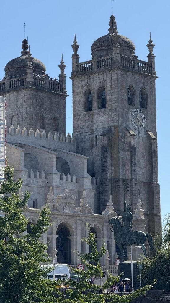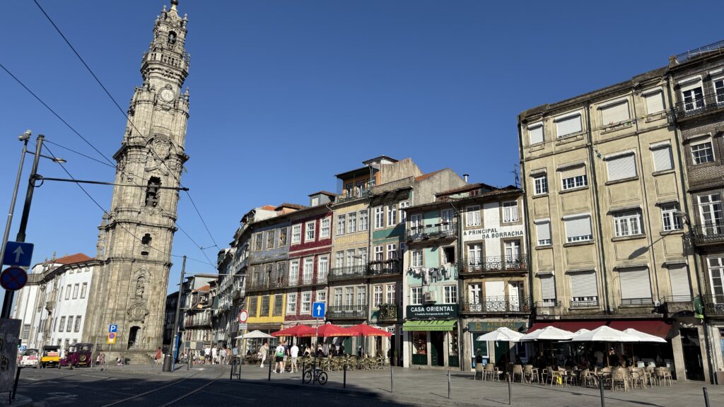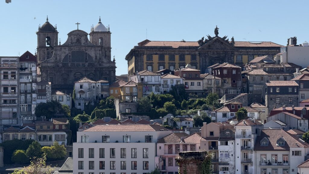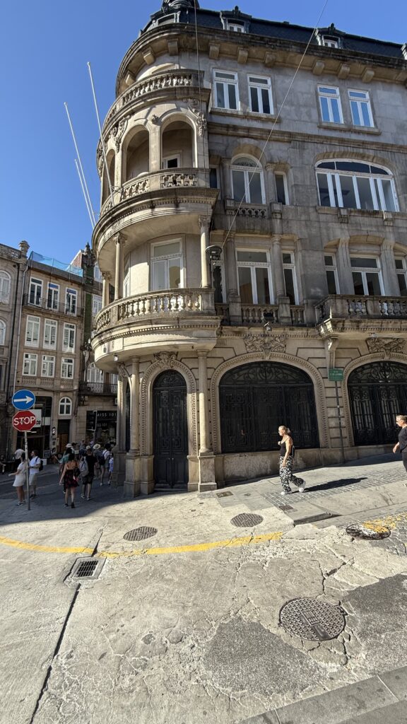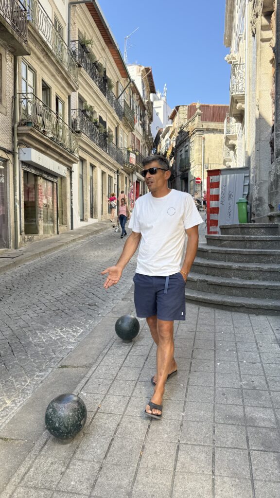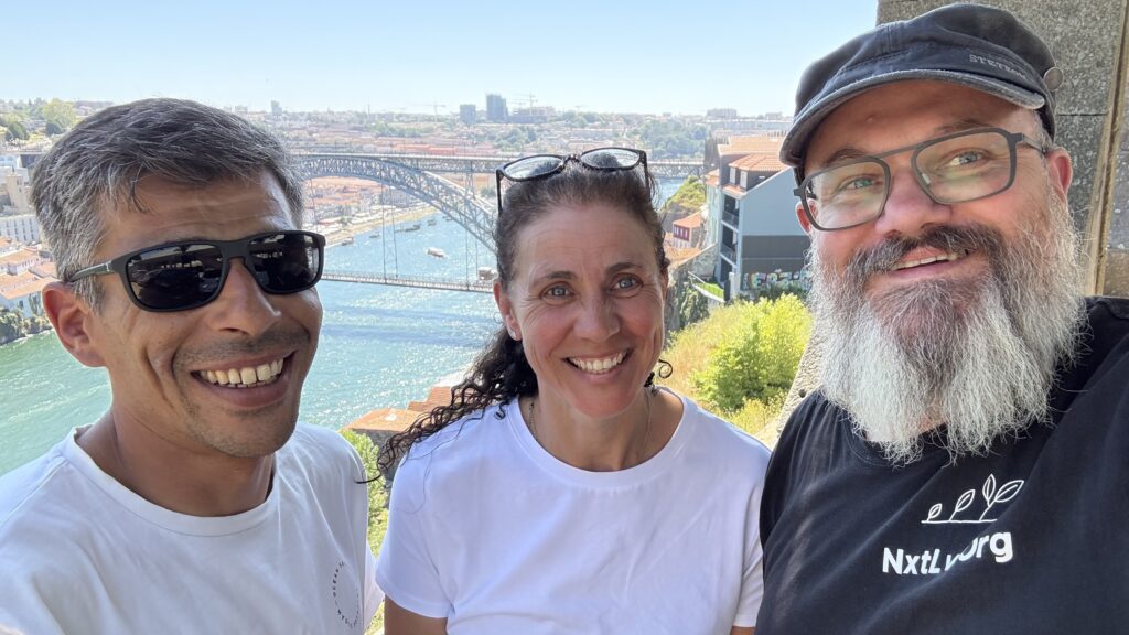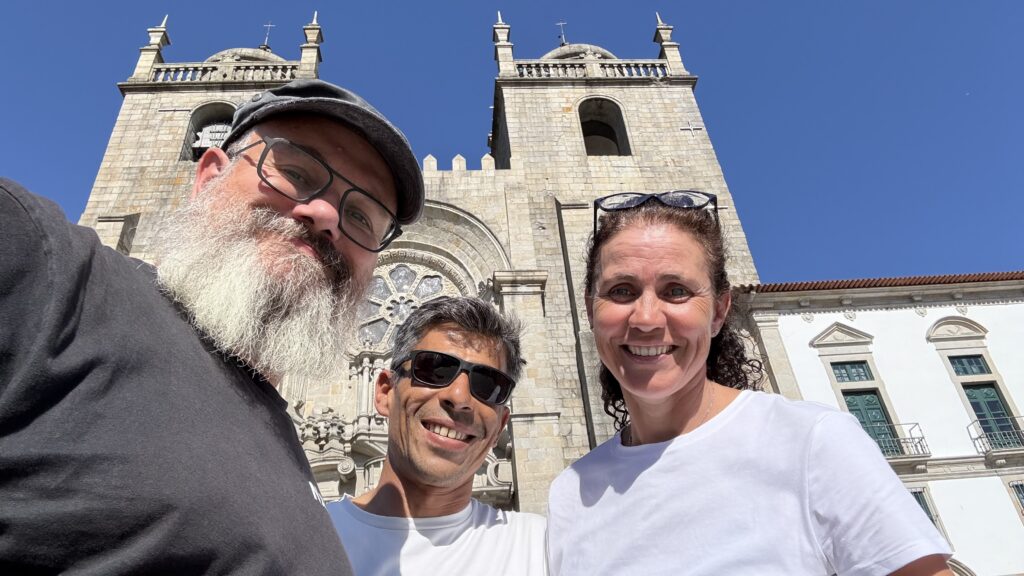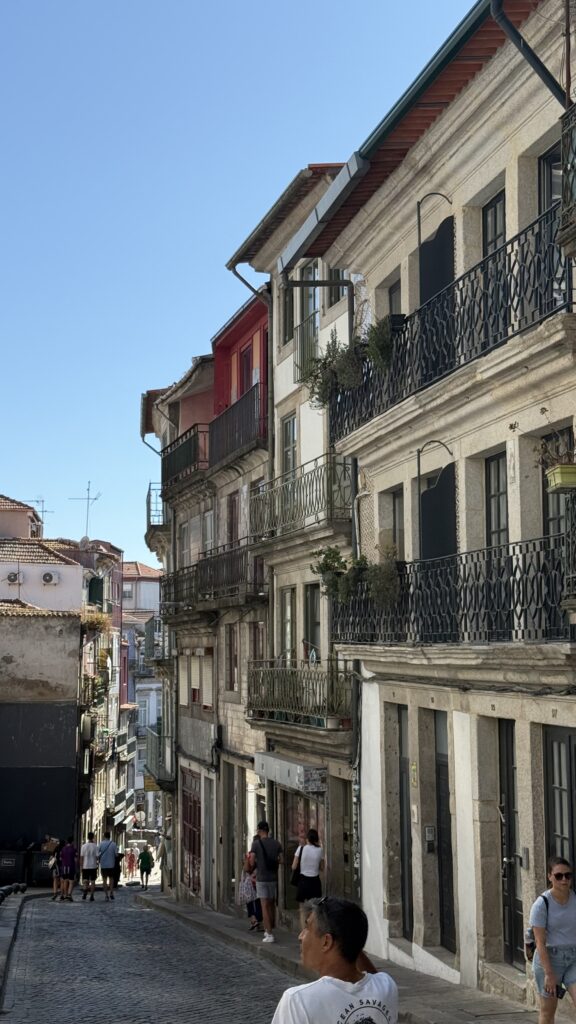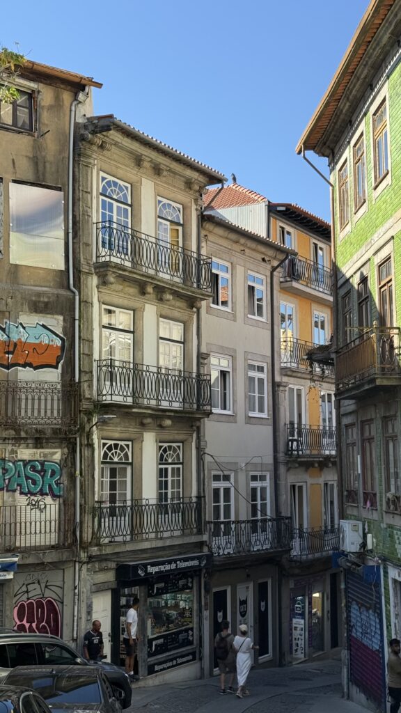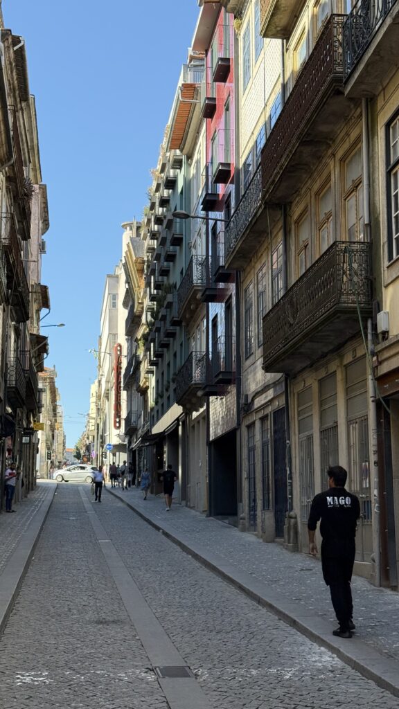 Kaum bin ich aus dem Bus ausgestiegen, fahren Ruben, Melanie und ich direkt in die Stadt. Porto empfängt uns mit 33 Grad im Schatten – also perfekte Bedingungen für eine Stadttour mit Steigungen. Wir laufen durch die Gassen, bergauf, bergab, lassen uns treiben zwischen alten Fassaden, flirrenden Sonnenflecken und den Klängen von Straßenmusikanten, die irgendwo zwischen Fado und Straßenromantik pendeln. Die Gebäude: prachtvoll, verwinkelt, warm in ihren Farben. Porto eben.