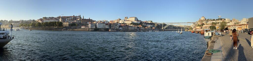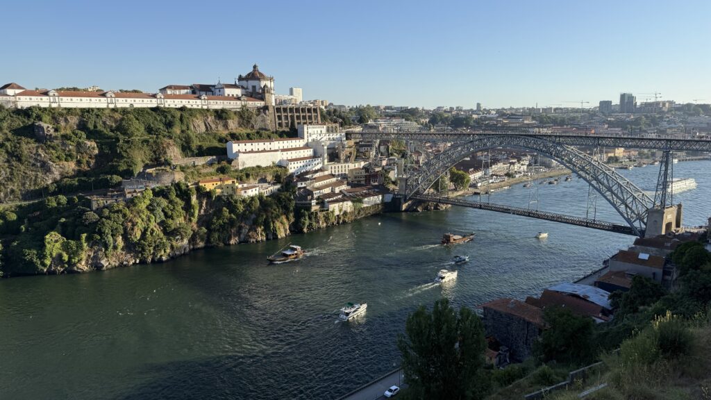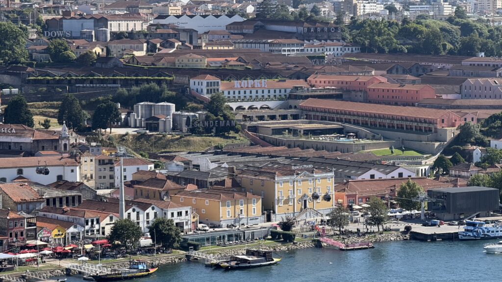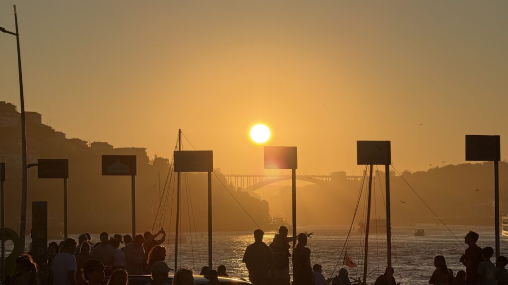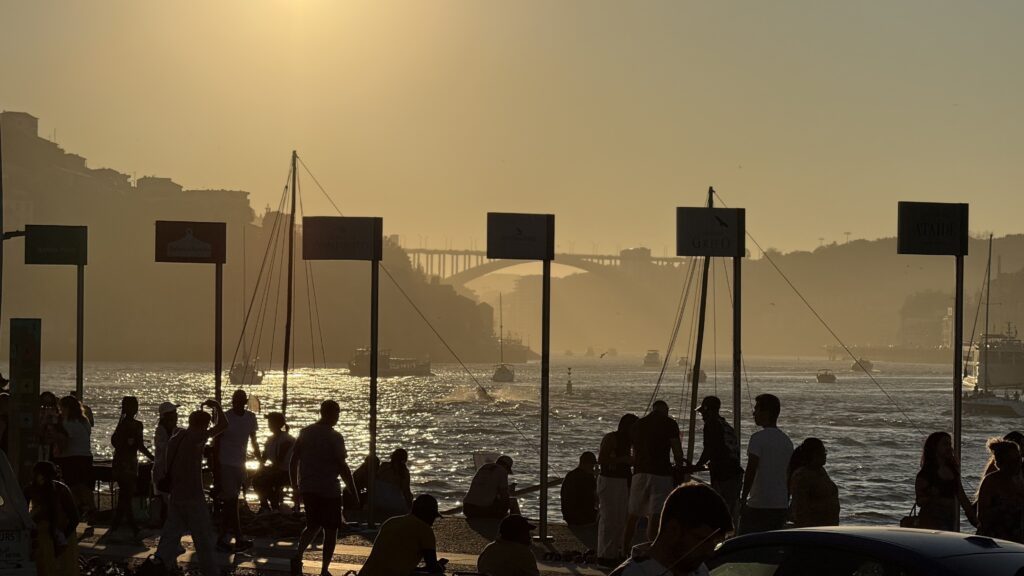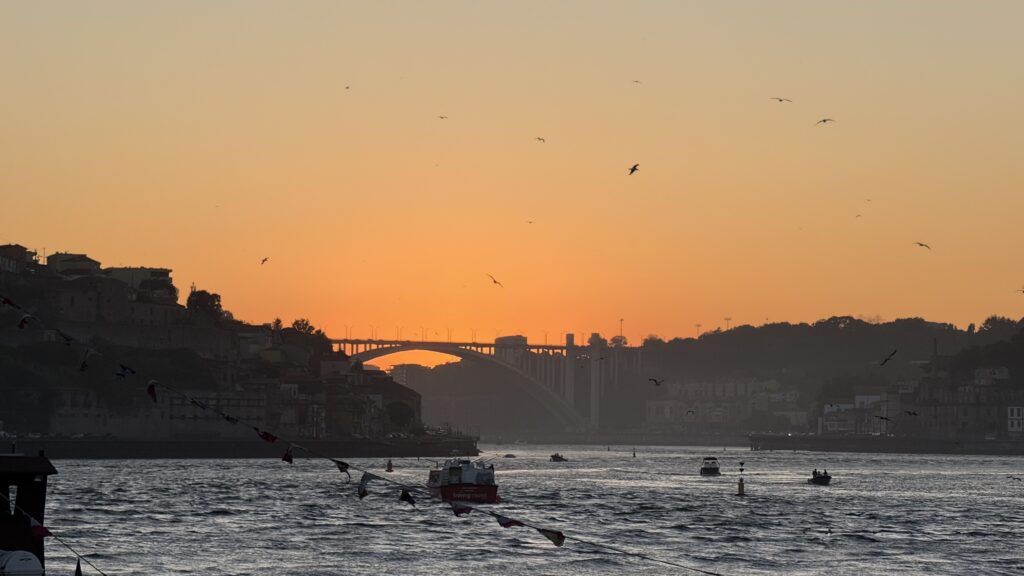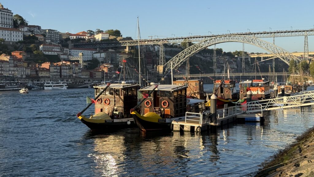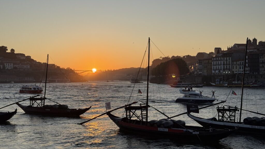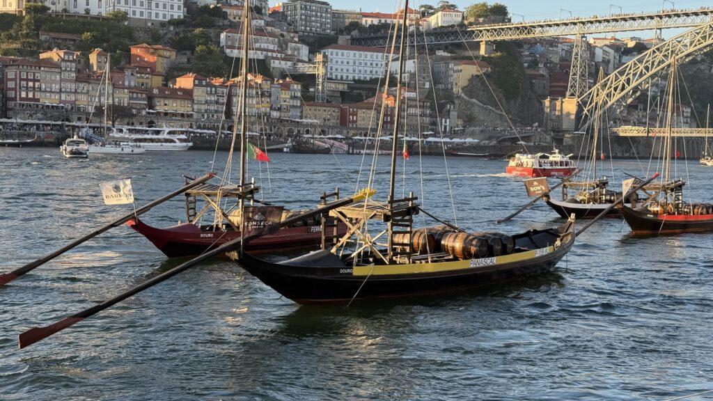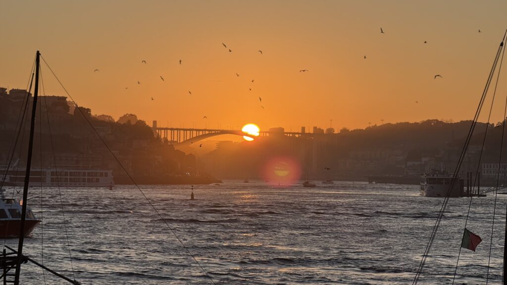 Danach wechseln wir die Flussseite – hinüber ins touristische Herz von Gaia. Dort, wo die Portweinhäuser wie elegante Zeugen einer langen Geschichte am Ufer stehen. Wo die Boote den Portwein aus dem Douro-Tal heranschaffen, um ihn hier zu veredeln. Und natürlich auch Touristenboote, wie Sand am Meer. Aber das Ambiente ist zauberhaft – warm, lebendig, leicht berauscht. Und natürlich trinken wir erst einmal einen Portwein. Gehört sich so.
