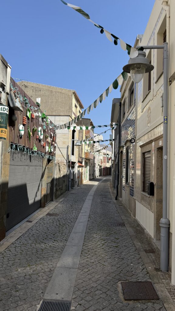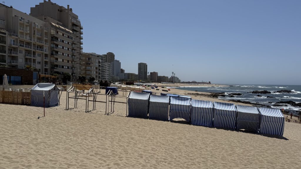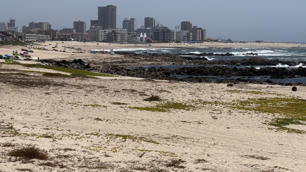 Der restliche Weg den ganzen Tag direkt am Meer entlang. Der Atlantik tost, Möwen meckern – und der Gegenwind bläst, was das Zeug hält. Kein Spaziergang, aber auch keine Strafe. Nur: Kraft. Besonders, wenn ich durch diese gescheiterten Ferienparadiese wandere – Hochhäuser in Zementoptik, verblichene Sonnenschirme, leergefegte Strände. Orte, die einst große Träume verkaufen wollten und heute still vor sich hin verfallen. Wer will hier noch urlauben? Das Meer allein reicht nicht – es braucht Seele, Flair, einen Hauch Magie. Nachhaltiges Bauen, nicht stumpfer Beton.