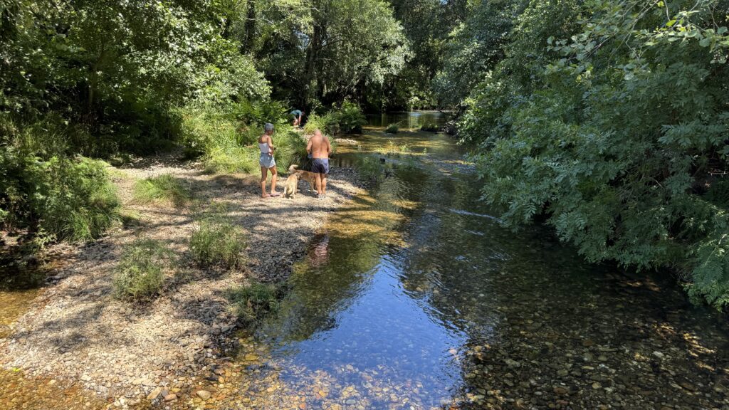 Nach knapp sechs Kilometern machen wir Pause. Direkt am Waldrand, in einer liebevoll improvisierten Pilgerimbisbude, die sich frech am Wegesrand eingenistet hat. Im Schatten sitzen andere Pilger, wir gesellen uns an einem Tisch dazu, genießen kalte Getränke, die Ruhe, das Leben. Noch drei Kilometer liegen vor uns – und alles ist entspannt. Zu zweit vergeht der Weg eben wie im Flug.