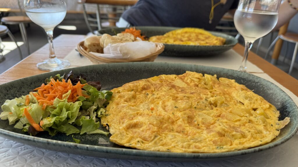 Die Distanz entschwindet zu zweit wie im Flug und die schweren Füße kommen erst die letzten Meter vor dem Finale. Am frühen Nachmittag hat Steffi in „Vila Praia de Ãncora“ eine charmante Unterkunft – schön und mit allem, was ihr Pilgerherz braucht gefunden. Wir beschließen, den gemeinsamen Teil des Tages gemütlich ausklingen zu lassen und steuern einen lokalen Imbiss an. Eigentlich wollen wir nur ein paar Tortilla-Chips knabbern, doch was dann auf dem Tisch landet, überrascht uns beide: ein großer Teller, liebevoll gefüllt mit hausgemachter Tortilla – also Kartoffeln, Ei, ein Hauch Zwiebel – zum Preis von nur 5 Euro. Nicht nur günstig, sondern verdammt lecker.