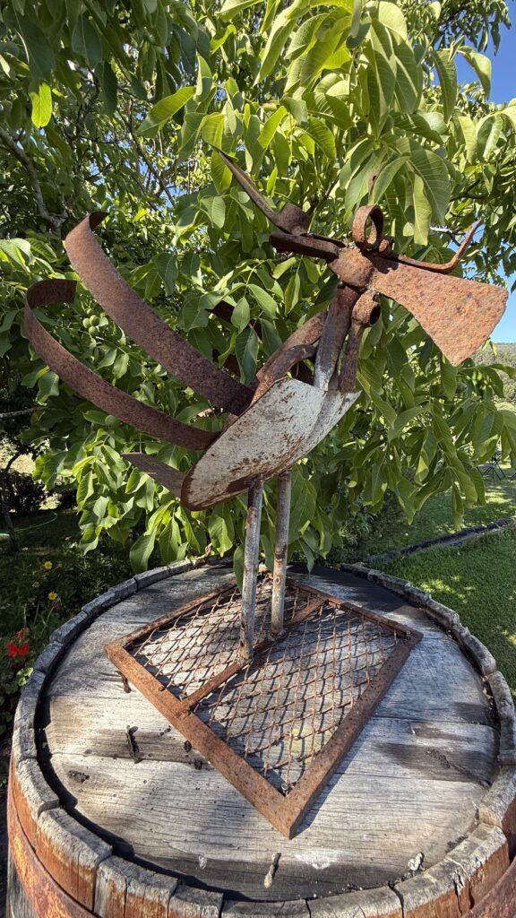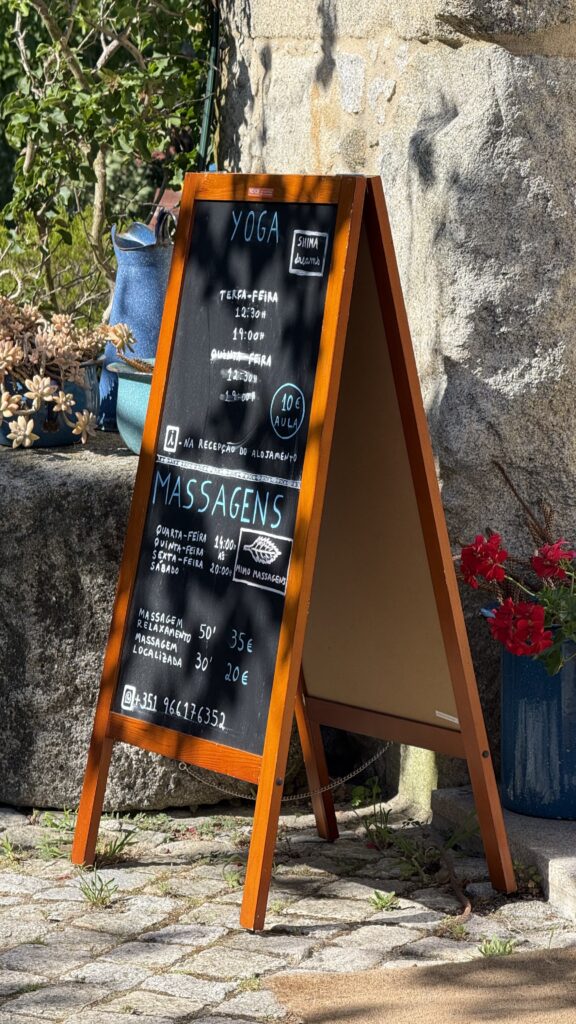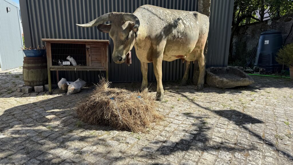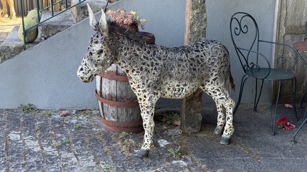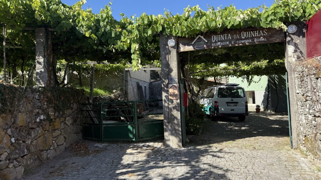 Die Herberge „Quinta da Quintas“ liegt folgerichtig oben in den Bergen, mit einem Blick, der mir kurz die Sprache verschlägt. Das Haus selbst? Ein riesiges Dachgeschoss mit liebevoll gezimmerten Holzbetten, alles handgemacht, stilvoll und warm. Draußen: ein Esel mit Jungtier auf einem eingezäunten Stück Land mit Weitblick. Passend dazu Meerschweinchen die jeden Gast laut fiepend um Fütterung bitten und einem kleinen Pool. Überall Kunst im Vintagelook, Sitzplätze, Hängematten, Bäume, die Schatten spenden und Obst, das einfach so wächst, als wüsste es nicht, wie glücklich es uns damit macht.