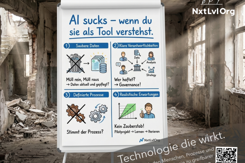 Das bedeutet: saubere Daten als Grundlage. Klare Verantwortlichkeiten als Rahmen. Hinterfragte Prozesse statt digitalisierter Ineffizienz. Und eine ehrliche Erwartungshaltung von Tag 1 — keine Versprechen, die die Realität nicht halten kann.